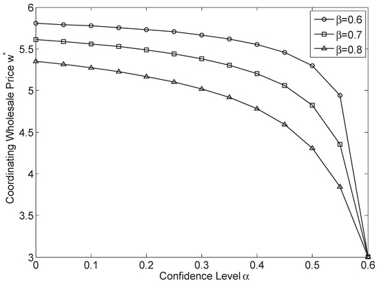 This theorem shows the sufficient condition for the existence and uniqueness of coordinating wholesale price. There is a threshold of confidence level that is independent of loss aversion and contract parameters, below which the supply chain can be coordinated. In particular, if , that is the objective is to maximize the expected utility, then there is always a wholesale price that can coordinate the chain. Moreover, if both and , the coordinating contract given by (13) are just that given by Xiong et al. [2] for risk-neutral setting. This result also offers an important managerial implication. When the downstream retailer is loss-averse and operates under CVaR, his loss-averse preferences and risk attitude have a significant impact on supply chain coordinating. In practical situations, the loss aversion and confidence levels can be determined through experiments (e.g., [37]). If his confidence level is small, i.e., , then the upstream manufacturer can select the wholesale price according to (13). Otherwise, supply chain cannot be coordinated no matter how the manufacturer sets the price.
