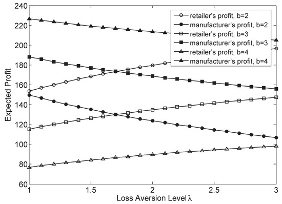 Figure 5 and Figure 6 show profit allocations for different loss aversion levels and confidence levels in the coordinating supply chain, respectively. When loss aversion or confidence level increases, the retailer’s profit increases while the manufacturer’s decreases. This means that to induce the retailer to increase order quantity and coordinate the supply chain, the manufacturer must transfer a portion of the profit to the retailer. From Figure 6 we also observe that supply chain coordination only exists within a certain range, e.g., and . Otherwise, the manufacturer’s profit is less than zero and channel coordination cannot be achieved. Moreover, these two figures illustrate that the higher the buyback price (purchase rate) is, the larger (less) the manufacturer’s profit is. One may intuitively think that the manufacturer should prefer a lower buyback price or higher purchase rate, but in fact the opposite is true. Since Figure 2 and Figure 4 show that a higher b or lower will result in a higher coordinating wholesale price, the manufacturer actually can gain more profit of the entire supply chain.