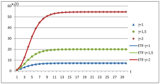 Figure 3 shows a trajectory whose values are the average of those obtained in the simulation of 100 trajectories, with the ETF. The values used in the simulation and the results obtained by estimating the parameters are shown in Table 3.