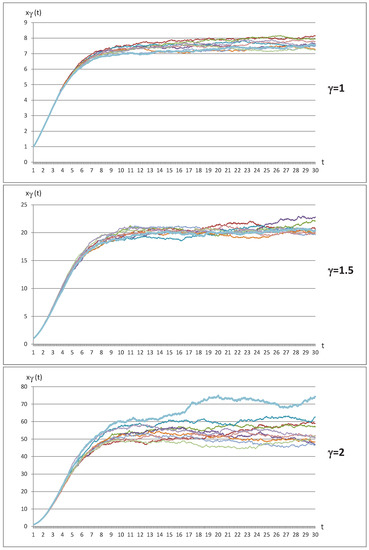 Figure 2 shows 10 simulated trajectories for ( and ), taking as the values for , and those obtained by maximum likelihood estimation (see Table 2). For each trajectory, 2901 data are generated by considering , and initial value .
