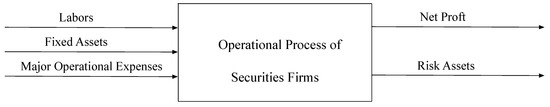 According to the actual operating process of a specific security firm, it is generally agreed that labor and capital inputs are the prerequisites for securities firms to make profits. Capital input in this paper mainly refers to securities firms’ operational expenses (E) and fixed assets (F), while labor input is represented by the number of laborers (L). Profits are generated through operations with the aforementioned inputs. As a major result of operations, the profit (P) is considered the desirable output. These input and output variables are consistent with those selected by Yeh, Wang and Chai [1]. Apart from desirable outputs, there are also undesirable outputs. The latter refers to operation-related assets of securities firms that may induce losses. According to the Measures for the Administration of the Risk Control Indicators of Securities Companies issued by China’s securities regulatory authorities, the total risk assets (R) reflect the operational risk of securities firms. This is regarded in this paper as a variable of undesirable outputs. The operational process of securities firms is shown in Figure 1.