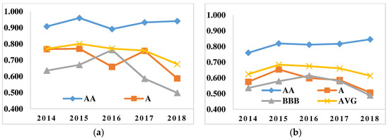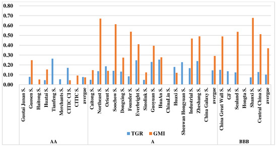 The MOI of AA firms was 0.150, lower than A firms (0.436) and BBB firms (0.471). Among all the companies, Guotai Junan Securities, ChinaLin Securities, Hongta Securities and China Galaxy Securities all had 0 overall inefficiency, indicating that they were all efficient managerially and technically in the group-frontier. TGR reflects the discrepancy in technical capabilities—the higher the TGR, the more a firm’s technical strength differs from the overall level. According to the results, the TGR of AA firms was 0.08, lower than BBB firms (0.1) and A firms (0.14). This reflects that AA companies’ overall technical capabilities are higher than those of the other two groups. BBB and A firms have an improvement scope of 10% and 14% respectively in this regard. Within the AA group, Haitong Securities and Guotai Junan Securities both had a TGR of 0, indicating that their technical capabilities had reached the meta-frontier level. In particular, the managerial inefficiency value of Guotai Junan Securities was 0, which means that its managerial capabilities are also in a leading position. The efficiency of Tianfeng Securities and Merchants Securities was mainly influenced by technical factors as they both had 0 managerial inefficiency. Their technical capabilities need to be further strengthened.