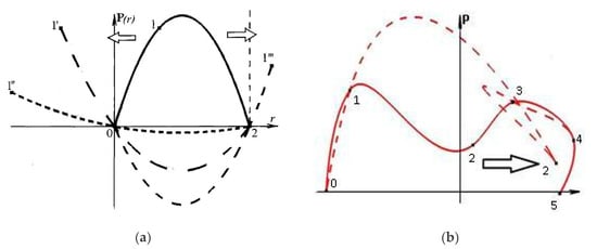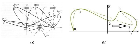 The peculiarity of the spatial parabolic curve formation method based on two flat overlapping parabolas proposed by Overhauser is that this curve is determined based on the linear interpolation operations of the corresponding vectors of two parabolic points, P(r) and Q(s). The vector P(r) is defined in the local coordinate system (LSC) based on the coordinates of the points of the first triad of four consecutive points specified in space. The second vector Q(s) is calculated in another LSC for the subsequent triad of these points. In this case, the abscissa axis of these LSCs is determined by the position of the first and third points of each triad. For the formation of parabolas with this method, it is necessary that in each LSC the second (middle) points of the triads of tasks of each individual parabola must be located within the ranges of the task of the first and third points (i.e., in the zone their abscissas are set along the r and s axes). However, this requirement cannot always be met in real conditions. In the case of assignment or editing (Figure 1a) the midpoint 1, (1′, 1″, 1‴) goes beyond the boundaries of this zone (0–2), then the parabola seems to be “turned inside out”. This leads to abrupt changes in both the shape and the adjacent parabolic curve sections (Figure 1b), which are shown by dotted and dashed lines, respectively.