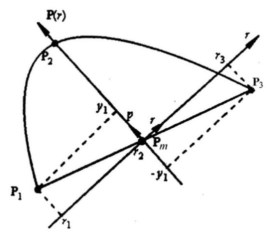 The drawbacks of these methods can be avoided with the correct choice of LSCs, in which descriptions of each individual parabola are created [9]. For this, the beginning of each LSC must be tied to the point Pm, which is located exactly in the middle between the extreme points P1 and P3 (Figure 2), rather than to the first triad point P1 in each parabola task. The axes of ordinates of such LSCs should then pass through the second P2 (middle) points of the task triad, and the abscissa axes should lie in planes, each of which is determined by the points of the corresponding triad.