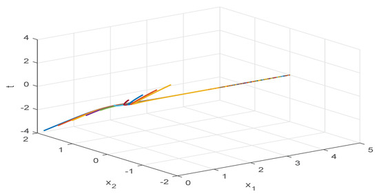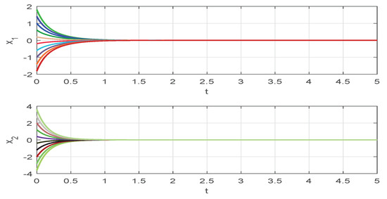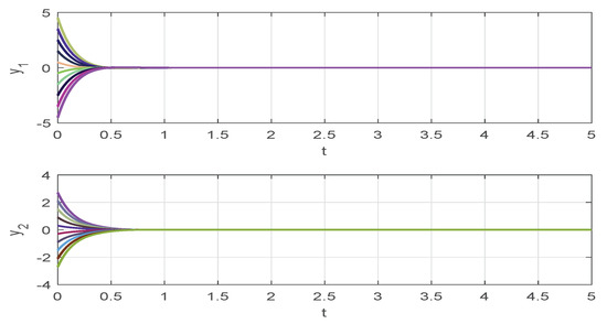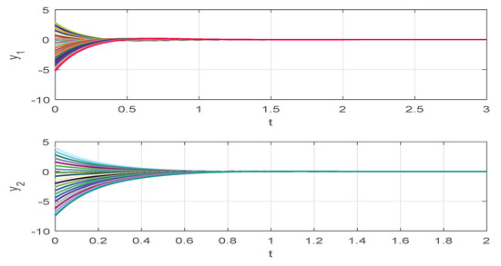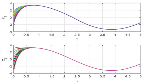 By using the MATLAB software package, the LMI (27) is true with . With 10 randomly generated initial values, Figure 1, Figure 2, Figure 3 and Figure 4 depict the time response of the real and imaginary parts pertaining to the model in (20) with . When and subject to the same initial conditions, the time responsed of the real and imaginary parts are shown in Figure 5, Figure 6, Figure 7 and Figure 8.