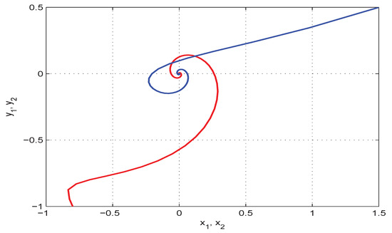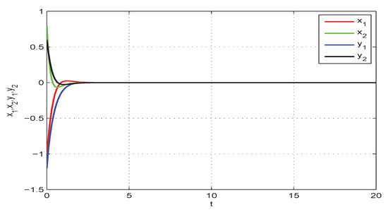. Take which satisfies and , and with the above parameters, we can use the MATLAB, the LMI (43) is true with . We obtain the following results with the initial condition . The time responses pertaining to the model in (13) with are depicted in Figure 15 and Figure 16. According to Corollary 2, we can confirm that the equilibrium point of the model in (5) or the equivalent real-valued model in (13) is global asymptotic stable.