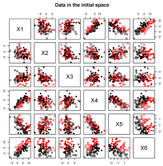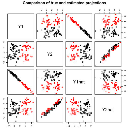 Thus the proposed model, based on the observed data , aims at recovering the clustering variables and as well as the associated cluster variables and . The initial data are presented on Figure 3, we see that the clustering structure of the data is not apparent from these scatter plots. The underlying clustering variables are presented on Figure 4, where we see the separation of the colors on the first clustering variable and separation of the shapes on the second clustering variable . Let us notice that such factorization gives a more synthetic view of the clustering than seeing these clusters as four clusters. Using standard dimension reduction techniques such as PCA does not succeed in recovering the clustering subspace see Figure 5. Performing a factorial discriminant analysis considering the four clusters in the supervised setting we get Figure 6, it finds good separation between the clusters, however we do not obtain the factorised interpretation of the clustering as the Cartesian product of two independent clusterings. Finally by performing the estimation of the model parameters in an unsupervised setting based on the data we get Figure 7. We see that succeeds in recovering up to a sign and that succeeds in recovering .