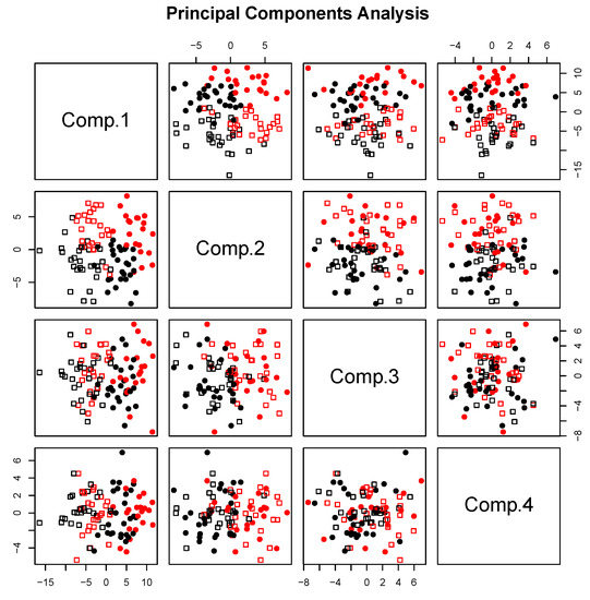 Scatter plot of the illustrative data on components one to four of the proimcipal component analysis (PCA).