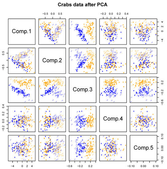 Let us consider the crabs dataset [20]. It consists of 200 crabs morphological data, each crab has two categorical (cluster) attributes—the species, orange or blue, and the sex, male or female. The dataset is composed of 50 males orange, 50 males blue, 50 females orange, 50 females blue for which 5 numerical attributes have been measured: the frontal lobe size, the rear width, the carapace length, the carapace width and the body depth. We can see the PCA of the data in Figure 8. We see that component two separates males and females well, whereas component three separates orange and blue subspecies. However, we will see that by applying our model we obtained a better separation of the clusters.