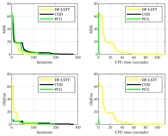 Comparison results of the DF-LSTT, CGD, and PCG algorithms with the signal parameter chosen as The x-axes represent the number of iterations (top left and bottom left) and the CPU time in seconds (top right and bottom right). The y-axes represent the MSE (top left and top right) and the function values (bottom left and right).