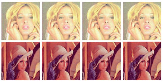 the peak signal-to-noise ratio (PSNR) [34], and the structural similarity index (SSIM) [35]. For fairness in comparing the algorithms, the iteration process of all algorithms started at and terminates when . For the image de-blurring experiment, the following parameters were used in our implementation: . We tested several images including Tiffany , Lena , Barbara degraded by Gaussian blur and 10% Gaussian noise.