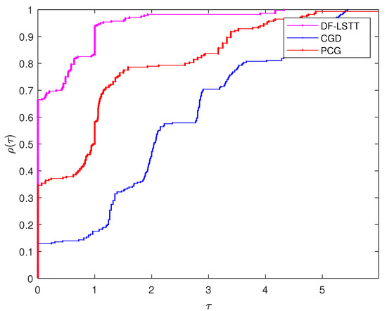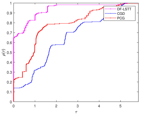 We note that is the probability for a method that is within a factor of the best possible ratio. Obviously, when takes certain value, a method with high value of is preferable or represents the best method. As usual, we obtain the number of iterations, number of function evaluations, and the computing time (CPU time) from the performance profile metric. Figure 6 and Figure 7 are the performance profile obtained based on the Dolan and Moré profile. Both figures indicate that the performances of the proposed method is competitive with the other methods. However, from both Figure 6 and Figure 7, DF-LSTT is more efficient because it was able to solve a higher percentage of the test problems with less number of iterations and function evaluations compared to CGD and PCG methods. However, with respect to CPU time, our algorithm did not perform well. This could be as a result of several computations involved in the method.