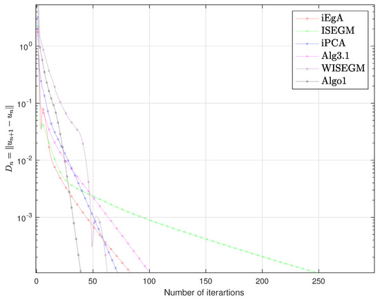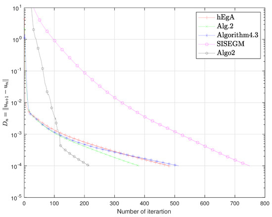 We now discuss the relationship between our scheme and the existing algorithms. The iterative scheme Equation (2) with a fixed step size is exactly the scheme proposed in [25] and without the inertial step, it reduces to the original subgradient extragradient scheme proposed by Censor et al. [26] where the underlying operator is monotone. The subgradient extragradient method has been studied, modified and improved by several researchers to produce variant methods. Most of these modifications used a fixed step size which depends on the factorials of the underlying operator such as strongly (inverse) modulus and Lipschitz constant. Therefore, algorithms with fixed step size require the prior knowledge of such factorials to be implemented. In a situation where such constants are difficult to compute or do not exist, such algorithms may be impossible to implement.