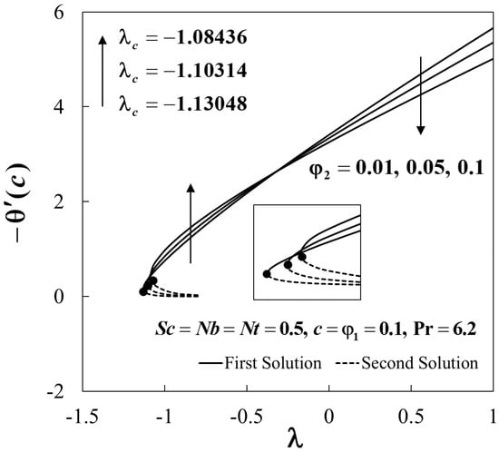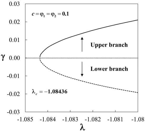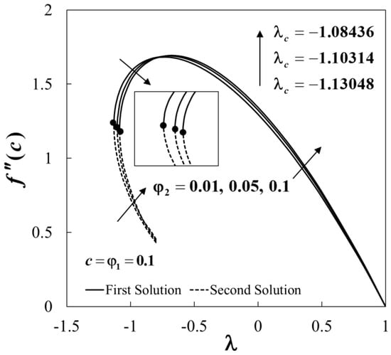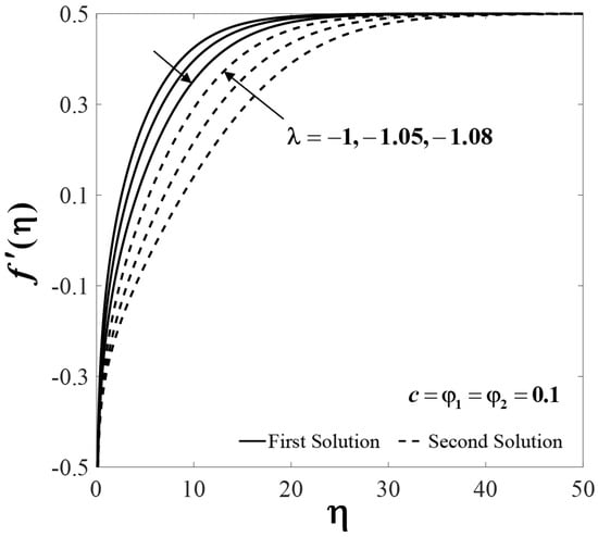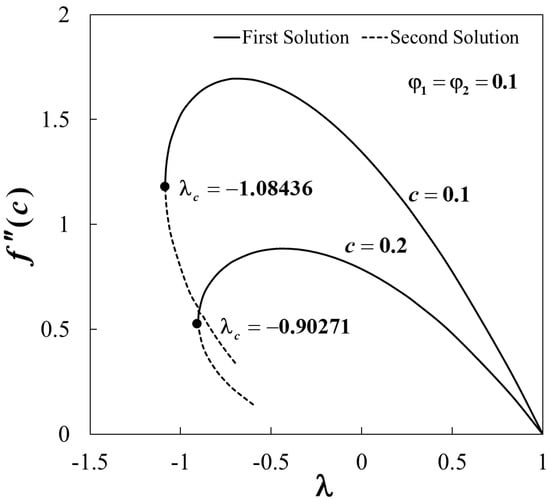 Figure 15 displays the smallest eigenvalue against when . As described in Equation (23), the flow is stable when there is an initial decay of disturbance as time passes, i.e., as . This will happen for . Meanwhile, the flow is unstable for due to the initial growth of disturbance as . From Figure 15, we notice that the values of are positive for the first solutions (upper branch), while they are negative for the second solutions (lower branch). Also, the values of approach to zero for both branches when . Thus, this finding confirms that the first solutions are stable and physically reliable in the long run, while the second solutions are not. Furthermore, we also conclude that the bifurcation of the solutions happens at the critical value .