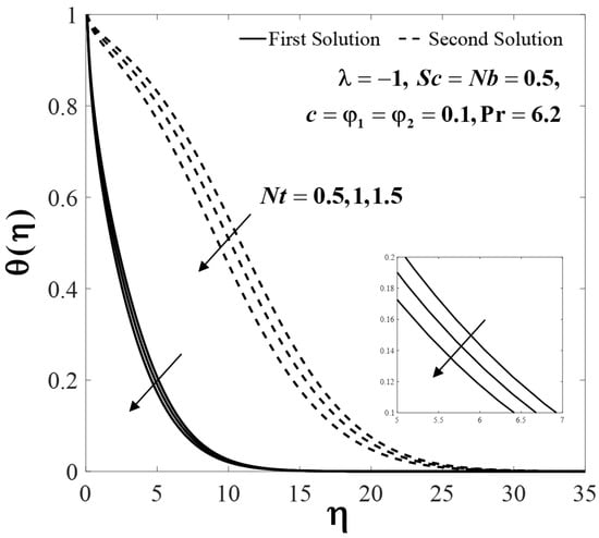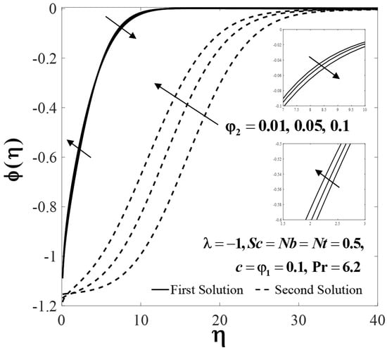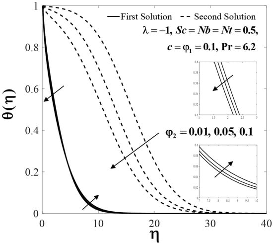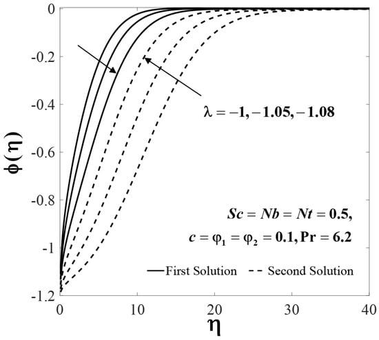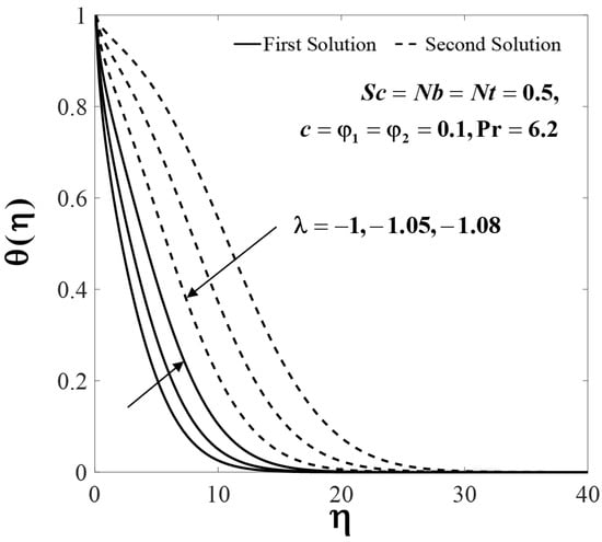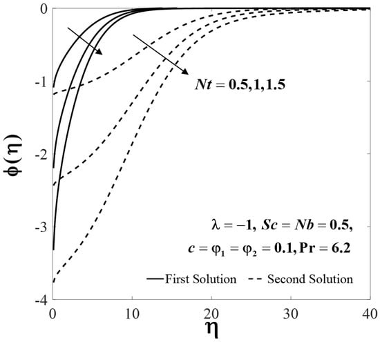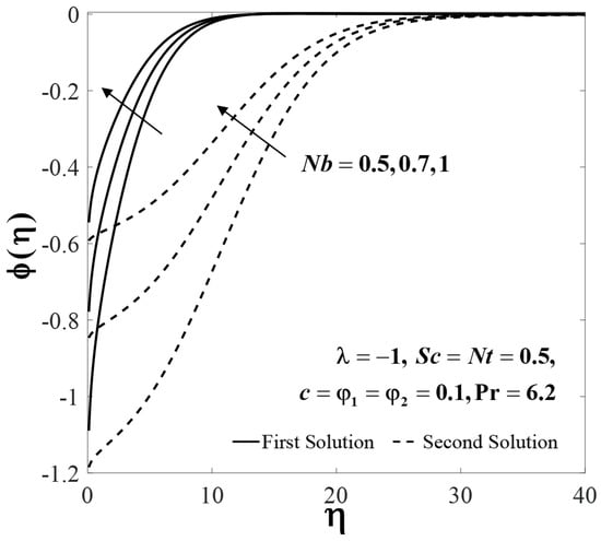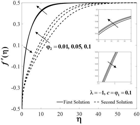 The impact of several parameters on the velocity , temperature and nanoparticle concentration profiles are presented in Figure 6, Figure 7, Figure 8, Figure 9, Figure 10, Figure 11, Figure 12, Figure 13 and Figure 14. These profiles asymptotically satisfy the free stream conditions (13), thus giving us confidence in the accuracy of the numerical solutions. Figure 6, Figure 7 and Figure 8 depict the effect of on velocity profiles , temperature profiles and concentration profiles when , , and . Small effects are observed for the first solutions (upper branch) of , and with rising , but the effects are more pronounced for the second solutions (lower branch).