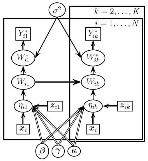 Note that the posterior inference considers the relationship between the covariates and the latent variables jointly with the prior distributions. Figure 2 shows a graphical representation of the proposed model. This is based on the doodle objects of WinBUGS []. It represents a direct acyclic graph, where the nodes are the model variables and the arrows show dependencies between them. There are two rectangular frames representing sets of identical repeating operations. One panel is indexed by i and ranges from one to N (subjects), and the second panel is indexed by k and ranges from two to K (time points). The variables  and , and  are represented by rectangular boxes, and they correspond to the response variables subject to measurement error and the exactly known independent variables, respectively. The stochastic variables  and  (latent variables related to the responses) are represented by oval nodes with the heads of the simple arrows pointing to them. The linear predictors  depend on the variables and parameters from which their arrows start, and these are represented by double-lined arrows pointing to them. Finally, the parameters  , and  are stochastic, with distributions depending on other hyperparameters.