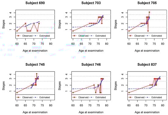 Figure 3 shows the observed and estimated trajectories for six subjects with measurement errors. The estimated dots represent the mean of the estimated true responses with non-decreasing patterns  The corrections performed seem to be in agreement with the dynamic progression of the disease. The observed and estimated stages for these subjects are presented in Table 7.