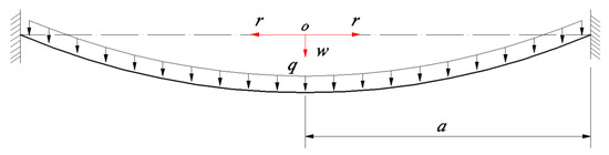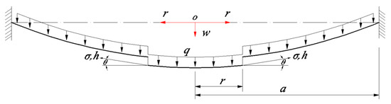 The uniformly distributed transverse loads q is quasi-statically applied onto the surface of a peripherally fixed and initially flat circular membrane with Poisson’s ratio v, Young’s modulus of elasticity E, radius a, and thickness h, as shown in Figure 1, where r is the radial coordinate, the dash dotted line represents the geometric middle plane of the initially flat circular membrane (in which the polar coordinate plane is located), and w is the transversal coordinate as well as the transversal displacement of the deformed circular membrane. Let us take a piece of the circular membrane with radius 0 ≤ r ≤ a in the central portion of the deformed circular membrane, with a view of studying the static equilibrium problem of this deformed circular membrane under the transverse loads q and the membrane force acted on the boundary of radius r, as shown in Figure 2, where denotes the radial stress (the mean stress over the cross-section of the deformed circular membrane), and θ is the rotation angle of the deflected membrane, that is, the usually so-called meridional rotation angle.