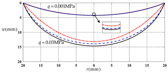 Usually, under the uniformly distributed transverse loads q, the rotation angle θ of the deformed membrane in the central portion of the circular membrane is smaller than that in the region far away from the center of the circular membrane. Therefore, the contribution of giving up the small rotation angle assumption to the improvement of the computational accuracy of the solution in the central portion should be smaller than that in the region far away from the center. Hence, the difference between the upper dash dotted line and the second dashed line in the central portion (about 0 ≤ r ≤ 5 mm) is smaller than that in the region far away from the center, as shown in the deflection profile for q = 0.03 MPa in Figure 4. It is clear that this difference is caused only by the so-called small rotation angle assumption of the membrane, because compared with the well-known Hencky solution (corresponding to the upper dash dotted line), our earlier solution (corresponding to the second dashed line) only gives up the small rotation angle assumption. Of course, such a difference also indicates that our earlier work in which only the small rotation angle assumption was given up [26] is also of positive significance to the improvement of the computational accuracy of the solution.
