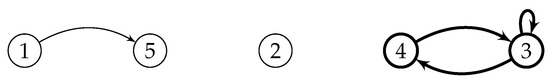 - Let and at the same time.According to Definition 1, for the digraph of each matrix , which contains the cycle the statementholds only in case, if . Thus, the digraph of each matrix which contains the non-trivial strongly connected component and the cycle , contains also the edge . Moreover, since , there exists an edge (based on the assumption ) in the digraph of each matrix . This implies that the digraph of each matrix which contains the non-trivial strongly connected component and the cycle , contains also the edges and . These edges connect the cycle with to a common non-trivial strongly connected component .