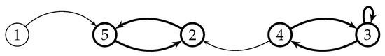- Let . Thus, . According to Definition 1 the following statement holds:Since , as well. This implies that there exist edges and in . Thus, the nodes lie in a common non-trivial strongly connected component .