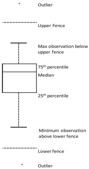 Amongst all the other methods, perhaps the simplest methods for studying outlier identification are the ones based on the mean and variance of each group of data such as the one presented by Burke et al. [], which is also the one adopted in this study. Simple plotting methods such as the boxplot shown in Figure 1 can be particularly useful to visualise the distribution of normal and outlier data points.