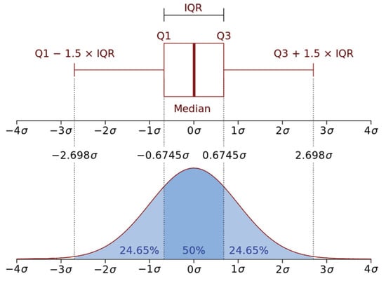 This method is called the interquartile range (IQR). It is a measure of variability in data and is based on dividing an ordered set of elements into quartiles as illustrated in Figure 1. IQR defines an outlier to be an observation that is outside the range for some constant []. The value is referred to as IQR.