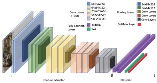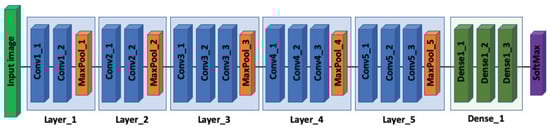 The first step in or multistage method is to use the pre-trained VGG-16 model to extract the maps of features of each image in the dataset. The model was developed in Python with the Tensorflow backend. The architecture of the VGG-16 model (illustrated in Figure 4) that we modified comprises five blocks of convolutional layers with max-pooling for feature extraction. The convolutional blocks are followed by three fully-connected layers and a final 1 × 1000 SoftMax layer (classifier). The original SoftMax layer was replaced by a 1 × 4 classifier to adapt our classification problem that is classifying three defects’ types and the normal type. The input to the ConvNet are 224 × 224 RGB images. The first block consists of two convolutional layers with 32 filters, each of size 3 × 3. The second, third, and fourth convolution blocks use filters of sizes 64 × 64 × 3, 128 × 128 × 3, and 256 × 256 × 3, respectively.