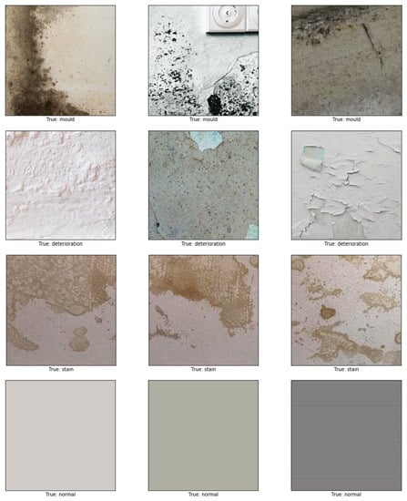 The dataset we used in this research contained images gathered from different resources: pictures taken by mobile phone, by a hand-held camera, and from copyright-free images scraped from the web. In order to increase the number of images in the dataset, the slice tool in Photoshop was used to create 224 × 224 thumbnails out of the large-sized images. In total, the number of images generated for this study was 2523 images. Each image in the dataset was assigned to one of four different classes: normal (image containing no defects), mould, stain, and paint deterioration (this includes peeling, blistering, flacking, and crazing). Assigning images to the right class (labelling) is the most crucial step in supervised machine learning. It is the key to a well-trained model and a high classification accuracy. The dataset was split randomly into 70% (1794 images) for training and the other 20% for testing (validation). The mould class in the training subset contained 448 images, the stain class also contained 448 images, paint deterioration contained 449 images, and, finally, the normal class also contained 449. The validation subset (732 images) was split equally between the four classes with 183 images each. Representative images from the dataset are shown in Figure 4.