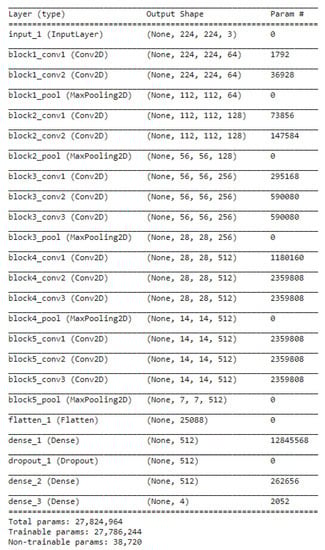 We re-trained the newly modified model on the raw dataset allowing the weights (up to block five) to update during training. We used the early convolutional layers in the VGG-16 (up to the fifth block) as a generic feature extractor. The shape of the input at the last layer of the fifth block is 7 × 7 × 512, as seen in Figure 5. The block is followed by another layer (flatten_1, Figure 6), which, as the name suggests, generates a vector of features of size 25,088. Figure 6 represents a summary of the modified VGG-16 model used in this study.