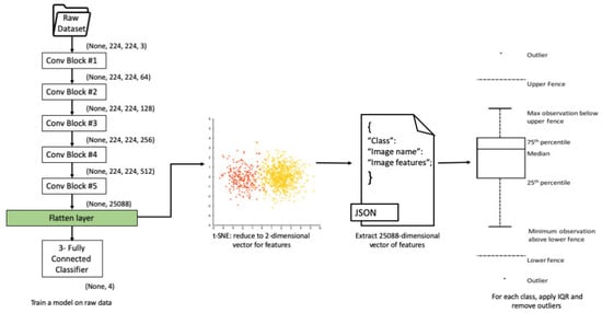 The final step is to use the interquartile range (IQR) on all the points in dimension 1 (–points) and the points in dimension 2 (–points) belonging to all images in every class. For each class of images, any point residing outside the range is regarded as an outlier, and the corresponding image is removed from that class. Figure 7 illustrates the pipeline for identifying outlier images. The block of pseudocode in Algorithm 1 represents the steps for detecting outlier images.