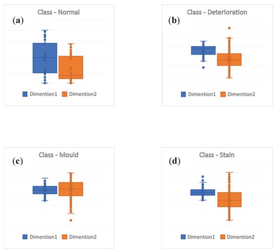 Summary of the interquartile range IQR boxplots. (a) shows no outlier images in the normal group; (b) IQR boxplot showing two outlier images in the deterioration class; (c) IQR boxplot showing one outlier image in the mould class; and (d) IQR boxplot showing three outlier images in the stain class.