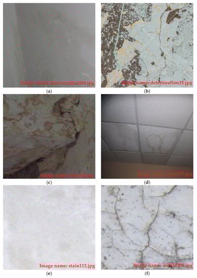 Outlier images in the training dataset. (a,b) represent outlier images from the deterioration class; (c–e) represent outlier images from the stain class, and (f) is an outlier image from the mould class.