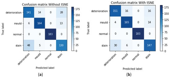 Confusion matrix: (a) without t-SNE; (b) with t-SNE.