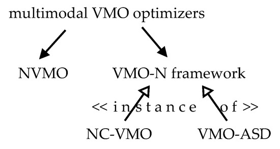 As it was originally proposed for global optimization, a few algorithmic proposals appeared to induce VMO to preserve (along the time) the multiple optima this method can find when solving multimodal problems (see Figure 2). They can be reduced to the following two approaches: the NVMO method and VMO-N, the generic niching framework for this metaheuristic. Those methods are described below in an overall fashion. Besides, considering that they are the two main adaptations of VMO to deal with multimodality, it is important to bring out a few differences between them, completing the first objective of this investigation.