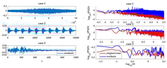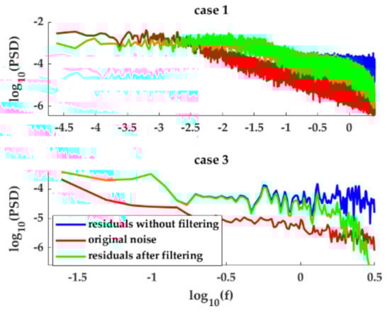 Figure 7) for case 1 and 3 highlights the impact of additional white noise. From Equation (9) and Equation (13), we notice that the GHE and WE need both low and high frequencies to perform the approximation of the Hurst exponent with trustworthiness; it seems advantageous to filter the high frequency noise of the residuals. In this contribution, we propose to apply a lowpass Butterworth filter of first order on the residuals from the cutoff frequency at which the PSD kicks towards white noise. This choice is not justified by empirical findings and we propose in the following to detail the reasons why we opted for the Butterworth filter.