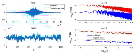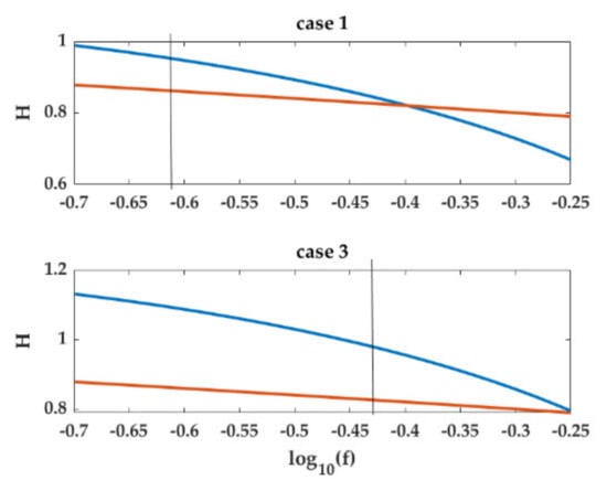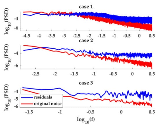 With the chosen cutoff frequency, the WE overestimates . Using a cutoff frequency of −0.35, instead of 0.4, for case 3 yields 0.88. Similar results are obtained for case 1 with the WE by increasing to −0.55. Unfortunately, the GHE decreases to 0.83 in both cases. However, considering that (1) no prior knowledge of the Hurst exponent was available, (2) additional white noise affects the residuals, and (3) model misspecification are present, this remains a good approximation of the true of 0.9. Indeed, this value of the Hurst parameter is known to be challenging to estimate since it is close to the limit between fGn and fBm.