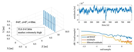 Figure 10 (right bottom) the plausibility of considering the noise of the TLS range as being fGn is confirmed; the blue line corresponds to a reference fGn of 0.9 and is nearly parallel to the yellow one from the filtered residuals.