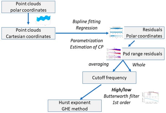 We start with the raw polar observations, which are to be transformed into Cartesian coordinates. After having parametrized the point cloud, a B-spline surface approximation is performed. The choice of the order of the B-splines is left to the user (e.g., cubic B-splines), as well as the method to fix the knot vector optimally or/and the number of CP to estimate. The residuals of the approximation are transformed backwards into polar coordinates; only the range residuals are further analyzed. They are plotted as a whole and line wise to visually identify the potential impact of model misspecification (low frequencies, repetitive pattern). These patterns could act—as a snow ball effect—on the determination of the Hurst parameter. As an important tool to understand the structure of the residuals, the PSD is plotted against the frequencies (a log–log plot should be used for a better visualization). Additional white noise or model misspecification can slide into the frequency domain; they are identified and filtered with a low pass Butterworth filter of first order. We recommend the use of the generalized Hurst estimator. This latter was shown to be robust to slight uncertainties in the determination of the cutoff frequency, as well as less sensitive to small samples effect, compared with the wavelet estimator. Thus, temporal variations of the Hurst exponent can be analyzed by making a line wise analysis of the Hurst parameters.