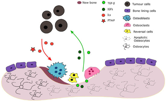 Tumour cells release several factors such as parathyroid hormone-related protein (PTHrP) and interleukins IL-6, IL-8 and IL-11 which promote osteolysis by stimulating osteoclast activity. A vicious cycle is established: factors that are trapped in the bone matrix and expressed during resorption, such as TGF-, vascular endothelial growth factor (VEGF) and IGFs stimulate tumour cells’ survival and proliferation and subsequently PTHrP production. [11,13,14,15].