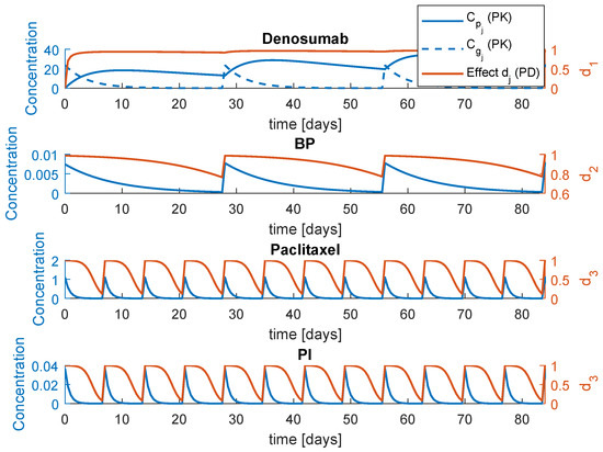 is the maximum effect of the drug . The system (3) is a general representation that comprises the four drugs. In reality, these drugs are grouped in three combined therapies: , and . This means that there are only two inputs: the anti-cancer drug effect and one of the three bone therapies effects, , or . The PK/PD response is illustrated in Figure 2. The parameters of this simulation can be found in Table 1, including the periodicity of administration . The PK/PD initial conditions for a single administration are obtained with , for and , for the remaining drugs. The parameters , and F correspond to the initial dose, volume distribution and bioavailability, respectively.