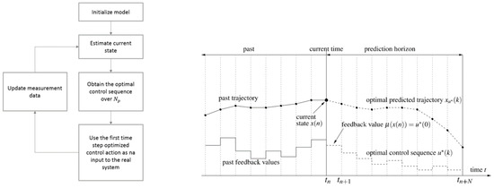 Flowchart of model predictive control (MPC) (left) and illustration of prediction horizon (right).