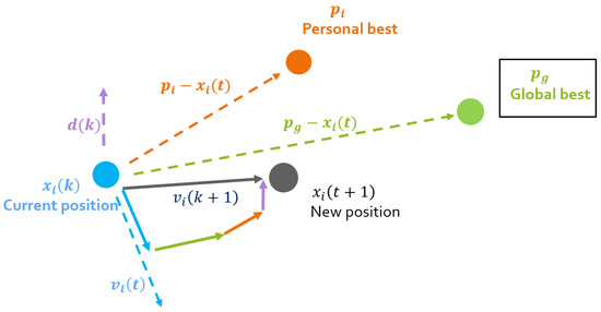 The swarm is composed by S particles wandering in a D-dimensional space. The position coordinates of each particle i are equivalent to a candidate solution. The particles’ position and velocity are updated taking into account advantageous positions of the surrounding partners. This position adjustment depends on the difference between the particles’ current position and two others: (the best position visited by particle i, and (the best position visited by any particle of the swarm). At each iteration k, the particles’ position and velocity vector are updated according to