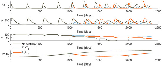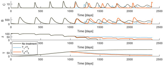 Model behaviour when the tumour arises at and the treatment begins at days.