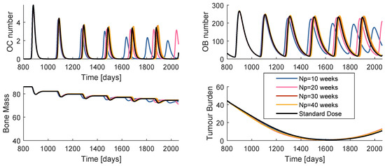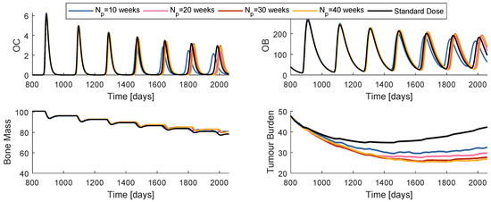 Future work includes adapting these methods of optimising cancer treatments for more accurate models, including mechanically induced bone remodelling [16], three-dimensional anomalous diffusion, modelled with fractional [41,42] and variable order derivatives [20,43,44], and additional biochemical interactions [4,17].