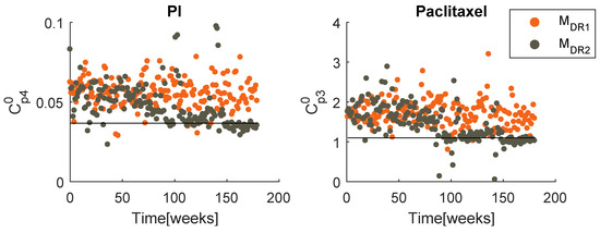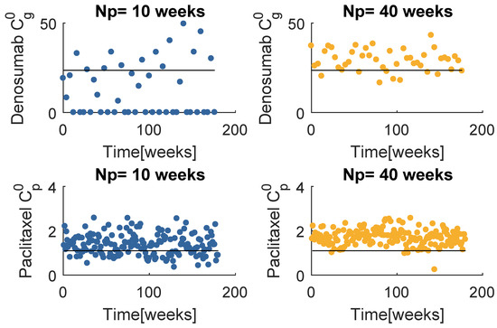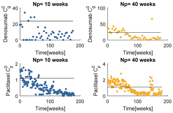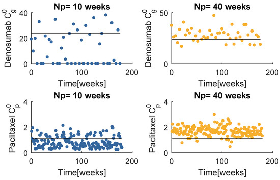Figure 8 contains the resultant prescription of denosumab and paclitaxel with the model , when and . The and mean values tend to coincide with a value higher than the respective standard dose, yet lower than the maximum values defined for this problem. Note that when , MPC obtains several null entries (22 out of 45 administrations), suggesting a higher for the denosumab. The increase in tends to produce a drug concentration distribution less variant.