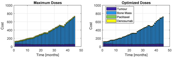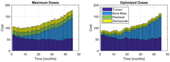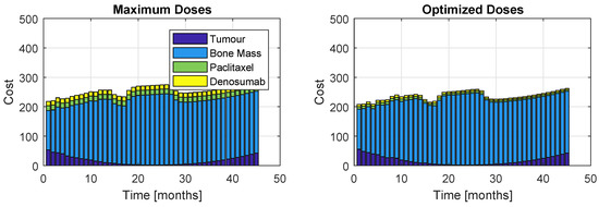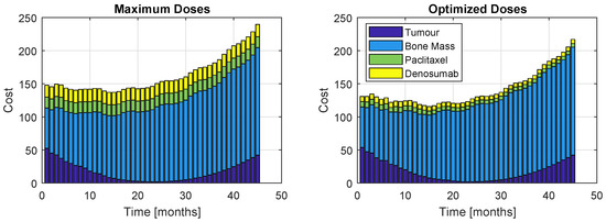 Although the algorithm accounts for one single cost, the proportions of each term of the objective function throughout the 45 months of treatment is displayed in Figure 11 (Model ) and Figure 12 (Model ). The left plots correspond to a patient who received the maximum dose allowed for this problem, while the right plots correspond to prescription resultant from optimization. As expected, the administration of the maximum allowable doses retrieve slightly better values for the tumour and bone mass associated cost; however, the inherent high administration cost does not allow this prescription to be a good option. Nevertheless, the optimization prescription outputs extremely close tumour and bone mass costs (in fact, almost indistinguishable) to those obtained with the most aggressive therapy. This represents a major advantage, since the patient is safeguarded from a therapy with higher drug exposure, but still obtaining very similar results.