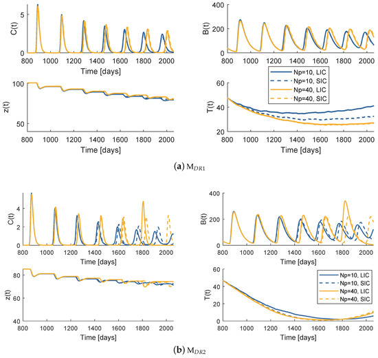 When handling , the resultant prescriptions differences are much more pronounced (Figure 19). All of the dose values decrease with time, and this variation is significantly more accentuated with a low initial global best position, of both denosumab and paclitaxel. In fact, approximately in the last two thirds of the treatment period, almost all of the doses are far below the standard values. The input sequences obtained with SIC and LIC, although very disparate, produced quite similar results on the system behaviour (Figure 18b). The PSO fitness values evaluated when LIC is used are about lower than those obtained with SIC when but are almost equal when . The tumour decrease with the LIC prescription when is not so fast, however the regrowth due to resistance is slightly postponed. Although this result translated in a higher cost associated to the tumour, the interpretation would be different if one attributed more importance to the late regrowth. In fact, this particular result supports the paradigm that says that the resistant population is delayed if the sensitive is not immediately eradicated.