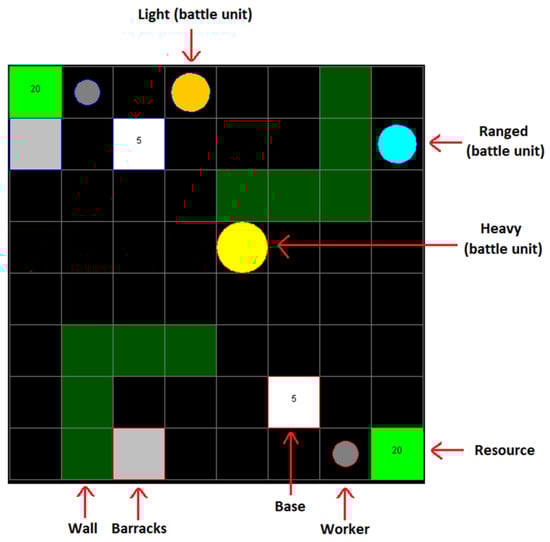 During the last decade, RTS games have become one of the best test beds for researching Artificial Intelligence (AI) for games [,]. The main reason for the growth in research is the fact that RTS games offer plenty of challenges for researchers. For example, RTS games are representatives of the highest class of computational complexity [], which is due to their extremely large state-action spaces [] (i.e., search space). Search space is often impossible to search exhaustively, because a specific game is a high-dimensional space of game variants (many different parameters are available), and it is also called game space [].