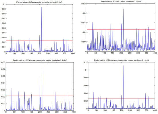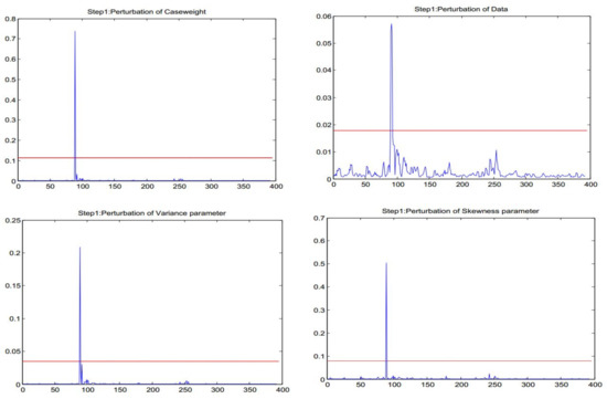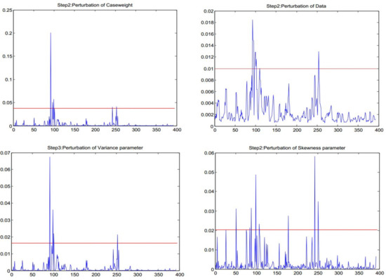 By applying the method in Section 3, we can conduct influence analysis for the SN AR(3) model. After calculating the observed Hessian matrix and the matrices for the four perturbation schemes of case-weights, data, variance parameter, and skewness parameter, we obtain the diagnostics matrices , , , and , respectively. In this case, we select the benchmark as , with the values of 0.1144, 0.0178, 0.0347, and 0.0791 established in the simulation study for the four perturbation schemes, respectively.
